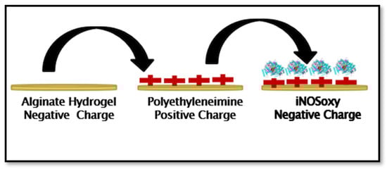 The interaction of amine groups in the PEI structure with carboxylate groups in the alginate moieties has the potential to stabilize the composite platform (Figure 2). In this study, sodium alginate is used as an anionic base layer, while polyethyleneimine is used as the cationic polyelectrolyte layer. A layer of NOS enzymes (iNOSoxy in this case), which is negatively charged at neutral pH, is adsorbed on the external PEI layer to start the alternate PEI/iNOSoxy nitric oxide releasing layers.