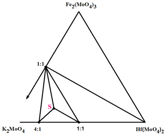 The powder diffraction data analysis of the annealed samples corresponding to several selected significant points of the K2MoO4–Fe2(MoO4)3–Hf(MoO4)2 system allowed us to determine the quasi-binary joins and to reveal the formation of a new triple molybdate. To prepare the samples of the selected compositions, the stoichiometric mixtures of the K2MoO4, Fe2(MoO4)3 and Hf(MoO4)2 molybdates were thoroughly ground in an agate mortar. The powder samples were annealed in the temperature range of 723–873 K for 150–200 h in the air. The single-phase K5FeHf(MoO4)6 sample was prepared by annealing the stoichiometric mixture of the simple molybdates at 873 K for 80–100 h. The phase equilibria of the K2MoO4–Fe2(MoO4)3–Hf(MoO4)2 system in the subsolidus region is shown in Figure 1. Six quasibinary cross-sections exist in the subsolidus region 823–873 K: KFe(MoO4)2–K8Hf(MoO4)6; KFe(MoO4)2–K2Hf(MoO4)3; KFe(MoO4)2–Hf(MoO4)2; KFe(MoO4)2–K5FeHf(MoO4)6; K8Hf(MoO4)6–K5FeHf(MoO4)6; K2Hf(MoO4)3–K5FeHf(MoO4)6. Thus, the formation of only one ternary molybdate was detected in the K2MoO4–Fe2(MoO4)3–Hf(MoO4)2 system.