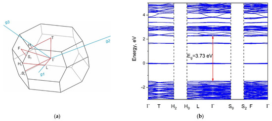 The Brillouin zone (BZ) and calculated electronic band structure of K5FeHf(MoO4)6 are shown in Figure 9a,b, respectively. The list of k-points defining the path along the Brillouin zone should be written as Γ-T-H2|H0-L-Γ-S0|S2-F-Γ. The coordinates of these points are Γ(0,0,0), T(0.5,0.5,0.5), H2(0.794,0.206,0.5), H0(0.5,−0.206,0.206), L(0.5,0,0), S0(0.353,−0.353,0), S2(0.647,0,0.353). The conduction band minimum and the valence band maximum are located in the center of the BZ, and the calculated direct band gap is equal to 3.73 eV. The obtained band gap value is typical of crystals with MoO4 tetrahedra [65]. As can be seen in Figure 10, the valence band maximum is dominated by the O-2p states, while the conduction band minimum is formed by Mo-4d states. Thus, we can say that the optical transitions in K5FeHf(MoO4)6 are associated with the charge transfer from oxygen to molybdenum ions. Some weak bands are observed in the electronic density of states (DOS), shown in Figure 10, for Fe and Hf ions, and these peaks are related to the narrow flat branches that appeared in the band structure at 1.48 and 3.14 eV above the valence band top (Figure 9b). The low-lying unoccupied levels predicted for Fe are, in fact, avatars of excited Fe 3d states that cannot be correctly calculated because the software used does not allow a switch on of the interaction between electrons within the 3d shell. However, the spectral measurements described in the next section show that the d-d transitions are really the lowest electronic excitations in the crystal under study, and the corresponding spectra look very similar to those for the isolated Fe3+ ion, which is in agreement with the band structure calculations.