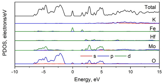 Total and partial electronic DOS of K5FeHf(MoO4)6.