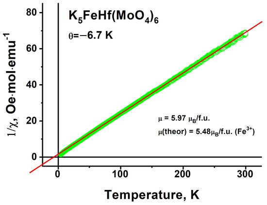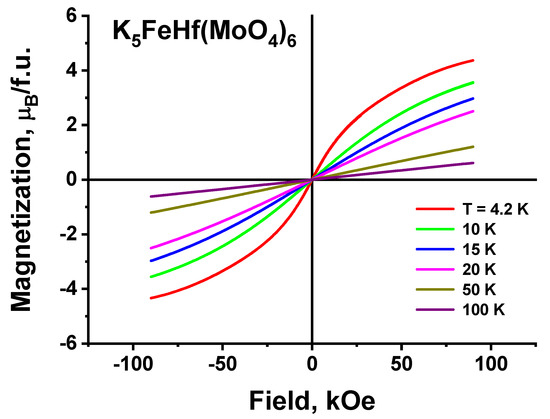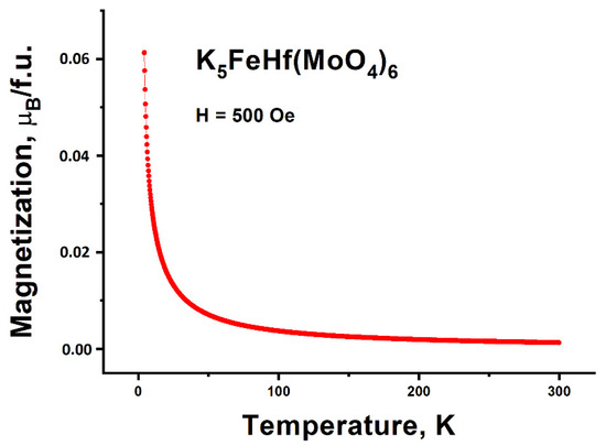 The temperature dependence of K5FeHf(MoO4)6 magnetization in the 500 Oe magnetic field is presented in Figure 14; this dependence evidences the paramagnetic state of K5FeHf(MoO4)6 down to 4.2 K. At low temperatures, in the vicinity of 4.2 K, the tendency of magnetic moment value saturation can be noticed, and that is a sequence of the orientation nature of K5FeHf(MoO4)6 paramagnetism.
