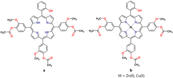 The molecular structures of the investigated porphyrins. (a) 5-(2-hydroxyphenyl)-10,15,20-tris-(4-acetoxy-3-methoxyphenyl) porphyrin, (b) 5-(2-hydroxyphenyl)-10,15,20-tris-(4-acetoxy-3-methoxyphenyl)porphyrinatozinc(II), 5-(2-hydroxyphenyl)-10,15,20–tris-(4-acetoxy-3-methoxyphenyl)porphyrinatocopper(II).