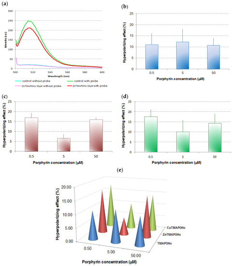 50 μM ZnTMAPOHo with probe); (b)—Hyperpolarizing effect for TMAPOHo; (c)—Hyperpolarizing effect for Zn(II)TMAPOHo; (d)—Hyperpolarizing effect for Cu(II)TMAPOHo; (e)—Comparative effect of porphyrinic compounds (24 h incubation time and 0.5 µM, 5 µM, 50 µM concentrations) on the transmembrane potential of U937 cells. In Figure 2b,c,d results are presented as mean hyperpolarizing effect (%) ± standard deviation (SD) for triplicate samples.