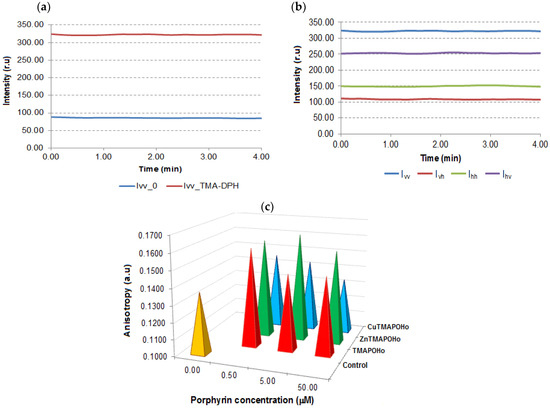 The comparative analysis of the values of the TMA-DPH anisotropy in the cell membrane (Figure 3c), indicated an increased anisotropy in the case of porphyrin-treated cells as compared to the untreated controls.