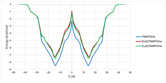 Previous studies revealed that some porphyrin derivatives can modulate ion channels by interacting with either extracellular or intracellular domains. For instance, heme was found to bind to the intracellular domains of Slo1, KATP, and Kv1.4 potassium channels [21,22,23], while a positively charged porphyrin derivative blocked the pores of neuronal Kv1 channels, possibly by binding to the extracellular domains [24]. We herein investigated, through an in silico method, the passive translocation of the three porphyrin derivatives across the cell membrane. All three compounds showed a high potential for permeating the cell membrane, since positive values for their intrinsic permeability coefficients through bilayer membranes (logPBLM) were obtained. The highest logPBLM value was observed for the free base porphyrin derivative (2.02), followed by the copper (1.11) and zinc (0.93) complexes. Moreover, the free energies of binding to the membrane were −8.54 kcal/mol for the free porphyrin, −7.50 kcal/mol for the copper complex, and −7.44 kcal/mol for the zinc complex, showing that the diffusion of the free porphyrin ligand was characterized by a lower transfer energy. The energy profiles along the bilayer normal are shown in Figure 4. Therefore, the assessed free base porphyrin and corresponding metalloporphyrins have the potential to translocate inside the cell and bind to various biological targets, including ion channels and pumps.