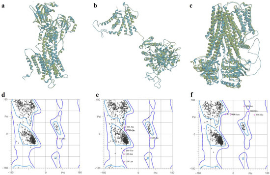 (a)—Superposition of SERCA2b model generated with YASARA (blue) on experimental (green) structure (PDB ID: 6LN9); (b)—superposition of Slo1 model (monomer) generated with SWISS-MODEL (blue) on experimental (green) structure (PDB ID: 6V35); (c)—superposition of SUR2 model generated with AlphaFold (blue) on experimental (green) structure (PDB ID: 7MIT); (d)—Ramachandran plot for SERCA2b model; (e)—Ramachandran plot for Slo1 model; (f)—Ramachandran plot for SUR2 model.