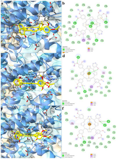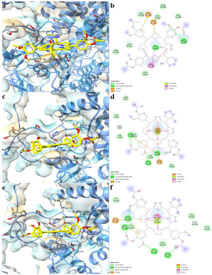 Predicted binding modes between positive controls and full-length structures of SERCA2b, Slo1, and the SUR2 subunit of KATP. (a)—predicted conformation of BHQ-SERCA2b complex; (b)—interaction diagram for BHQ-SERCA2b complex; (c)—predicted conformation of heme-Slo1 complex; (d)—interaction diagram for heme-Slo1 complex; (e)—predicted conformation of heme-SUR2 complex; (f)—interaction diagram for heme-SUR2 complex. Metal coordination bonds are represented as purple dashes.