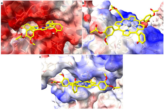 Further, we analyzed the electrostatic potential maps of the binding sites for all three target proteins, exemplified for the predicted complexes with the zinc metalloporphyrin derivative. For SERCA2b it can be noted that the binding site is characterized by mostly low electrostatic potential energy values, which is correlated with a large number of negatively charged residues (aspartate and glutamate) with key roles in calcium binding and transport. The liganded zinc is complexed by aspartate residues, the porphyrin ring and the hydroxyl moiety within the porphyrinic structure are involved in electrostatic interactions with the same negatively charged residues. On the other hand, the phenyl rings make contacts with more neutral residues, through non-electrostatic interactions (Figure 10a). The electrostatic potential energy values within the core of the binding site of Slo1 are closer to neutrality, since zinc is complexed by a cysteine. In this case, the porphyrin ring is involved in non-electrostatic interactions with the binding site, such as pi interactions, while the substituted phenyl rings bind to positively and negatively charged residues through both electrostatic and non-electrostatic interactions (Figure 10b). In the case of SUR2, the porphyrin ring and metal atom interact with residues characterized by higher electrostatic potential energy values (histidine), while the substituted phenyls bind with other residues through both electrostatic and non-electrostatic interactions (Figure 10c). Therefore, the three binding pockets have different properties in terms of electrostatic potentials, and the porphyrinic structures can interact with the binding sites via various types of molecular interactions.
