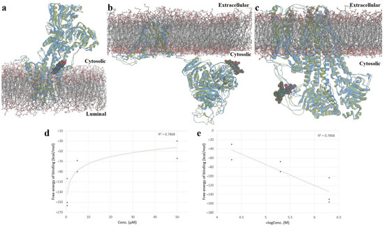 (a)—Superposition of simulated conformation (green) of Cu(II)TMAPOHo-SERCA2b complex on original structure (blue); (b)—superposition of simulated conformation (green) of Cu(II)TMAPOHo-Slo1 complex on original structure (blue); (c)—superposition of simulated conformation (green) of Cu(II)TMAPOHo-SUR2 complex on original structure (blue); (d)—exponential relationship between free binding energy values and tested porphyrin concentrations; (e)—correlation diagram between free binding energies and negative logarithmic values of tested porphyrin concentrations. Solvent molecules are hidden for clarity.