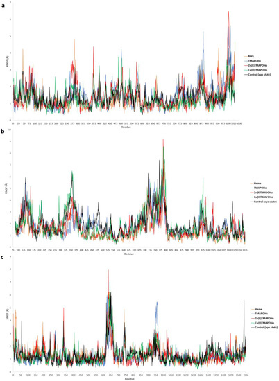 The root mean square fluctuations (RMSF) of amino acid residues were also analyzed, following the short MD simulations. For SERCA2b, lower fluctuations were observed in the amino acid sequence located within the binding site (residues 55–61, 244–260), when compared to the apo state protein simulation (Figure 12a). However, higher conformational changes could be seen in other regions. Moreover, the structural conformations of both Slo1 and SUR2 were more stable when bound to heme and the other two metalloporphyrins (Figure 12b,c). Lower fluctuations were noticed for residues 679–695, located within the Slo1 binding site. The same observation could be made for the SUR2 binding site, since lower RMSF values were recorded for residues 649–656 and 741–745.