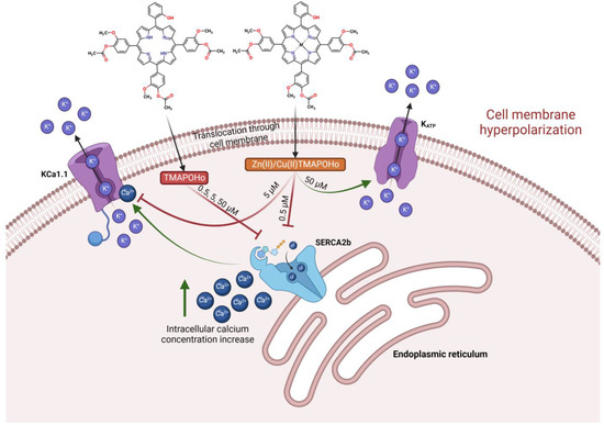 We hypothesized that the three asymmetrical porphyrins induced a hyperpolarizing effect on the cell membrane by blocking the sarco/endoplasmic reticulum calcium ATPase SERCA2b at 0.5 µM concentrations, thus increasing the levels of cytosolic calcium. SERCA2 is an ion pump involved in the reuptake of Ca2+ from the cytosol into the endoplasmic reticulum lumen and has two isoforms, SERCA2a, being expressed in cardiac and skeletal muscles, and SERCA2b, which occurs ubiquitously [58]. Cytosolic calcium would thereafter stimulate the calcium-activated potassium channel BK Slo1 (KCa1.1), inducing potassium leakage to the extracellular space and hyperpolarizing the cell membrane.