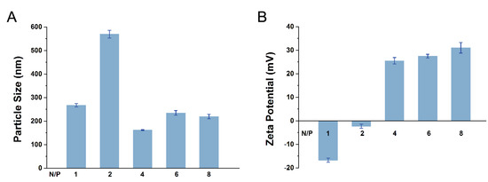 Changes in particle sizes (A) and zeta potentials (B) of the lipoplexes, along with the increases in N/P ratios. Data represent mean ± SD (n = 3).