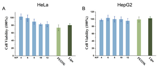 To assess the biocompatibility of the prepared lipoplexes, the cytotoxicity was measured by using MTT (3-(4, 5-dimethylthiazolyl-2)-2, 5-diphenyltetrazolium bromide) assay, using HeLa and HepG2 cell lines as the model organisms in a serum-free medium. After 24 h of incubation, the cytotoxicity was examined through cell viability, where lipofectamine 2000 and PEI25K were used as controls. According to the results in Figure 5, cells treated with QM-SS-KK/DOPE/pDNA complexes showed >80% viability in both cell lines even at the high N/P ratio of 12, indicating that the novel lipoplexes were of low cytotoxicity, and therefore, its biocompatibility was good enough for further transfection.