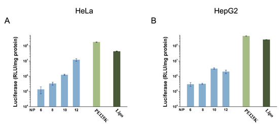 HeLa and HepG2 cells were inoculated into 24-well plates at 8 × 104 cells per well in a complete medium (0.5 mL per well). A day prior to transfection experiments, the medium was discharged, and another 1 mL of fresh medium was added with/without the supplement of FBS. QM-SS-KK/DOPE/DNA complexes, containing 1 μg of plasmid DNA at designed N/P ratios, were introduced to each well for another 4 h incubation. The medium was again replaced by 0.5 mL of fresh medium, followed by another 24 h incubation at 37 °C. For luciferase assays, the cells were transfected by pGL3 plasmid DNA lipoplexes. The Picagene luciferase assay kit (Tokyo Ink, Tokyo, Japan) was adopted. The transfected cells were washed with PBS three times and lysed in a cell lysis buffer. The lysate was centrifuged at 4 °C and 4000 rpm for 2 min to collect the supernatant. The relative light unit (RLU) of chemiluminescence was determined with a luminometer (Turner Designs, 20/20, Promega, Madison, WI, USA), and the luminescent RLU values were normalized by the protein content, which was measured by the BCA (bicinchoninic acid) assay. Transfection with lipofectamine 2000/DNA complexes and PEI25K (N/P = 10, 1 μg DNA, diluted with the optimum medium) were taken as the positive controls [13,14,17].