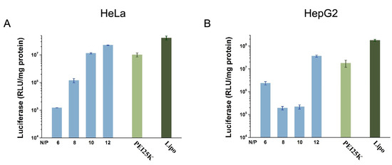 The gene transfection efficiency (TE) of the QM-SS-KK in vitro was studied with HeLa and HepG2 cells. The pGL3 plasmid was adopted as the luciferase reporter gene, while lipofectamine 2000 and PEI25K were taken as controls. Cells were transfected with QM-SS-KK/DOPE-pGL3 plasmid complexes of different N/P ratios for 24 h in a serum-free medium. A subsequent analysis through quantitative luciferase expression showed that the TE of the QM-SS-KK/DOPE is dramatically increased by increasing the N/P ratio in HeLa cells (Figure 6A). In addition, QM-SS-KK/DOPE also showed better TE at higher N/P ratio in HepG2 cells. However, the TE values of QM-SS-KK/DOPE were lower than those of lipofectamine 2000 and PEI25K (Figure 6A,B).
