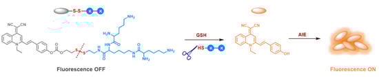 Vector-mediated gene transfection is a multistep process, and the vector needs to solve the dilemma of potent extracellular DNA protection versus intracellular easy release [9]. Moreover, understanding the gene transfection step and the transport mechanism is also extremely important for gene delivery. Multivalent cationic lipids using biocompatible amnio acids or peptides as polar domains have strong electrostatic interactions with negatively charged nucleic acids, which lead to better DNA condensation and more cellular uptakes [10,11,12,13,14]. To facilitate the intracellular DNA release, gene delivery vectors with biological reduction-responsive capacities have received increasing interest. There are significantly different GSH concentrations in the extracellular and intracellular environments [15,16]. Disulfide-bridged vectors can be disintegrated in a cytoplasm through the specific response to the redox potential of GSH, resulting in the detachment of DNAs from vectors through thiol-disulfide exchange reactions [12,13,14,15,16]. In addition, the introduction of reduction-responsive and biodegradable disulfide into the skeleton of the cationic lipids could also alleviate their cytotoxicity. To track the gene transfection process, fluorescent dyes, such as naphthalimide [2,17], tetraphenylethylene [18,19,20], and triphenylamine [21,22], have been used to functionalize the vectors. Among them, vectors with aggregation-induced-emission (AIE) characteristics have a strong emission capability in aggregation states, which can overcome the drawback of the aggregation-caused quenching (ACQ) effect, and have great potential in biomolecule detecting and delivery tracking [23,24,25]. As a new class of AIE building block, the chromophore quinoline-malononitrile (QM) has several prominent features, such as red to near-infrared (NIR) emission, marked photostability, excellent brightness, and good biocompatibility [26]. It holds great potential in organelle imaging, biomolecule detecting, and biological process monitoring [26,27,28]. Recently, Zhu et al. developed two excellent enzyme-activatable AIE fluorescent probes, QM-HSP-CPP and QM-GFTN, which are based on QM [29,30]. These probes were successfully applied to the fluorescent diagnosis of pancreatic cancer and autophagy, respectively. The peptide unit improved the dispersibility of probes and turned off the fluorescence. After the hydrophilic peptide was cleaved by a specific enzyme, the fluorescence recovered with a high signal-to-noise ratio [29,30].