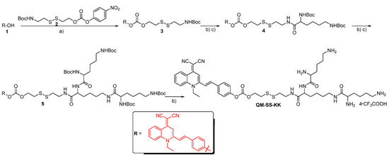 Synthesis of QM-SS-KK. Reagents and conditions: (a) DMAP, (b) CF3COOH, CH2Cl2, and (c) Nα,Nε-di-Boc-l-lysine, isobutyl chloroformate, NMM.