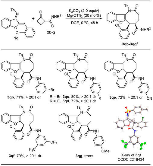 Subsequently, an investigation of the scope of the cyclobutanone was conducted using 1q as a model azadiene (Scheme 3). The electronic and steric character of the N-aryl amides of the cyclobutanone were evaluated by varying various substituents at different positions. Cyclobutanone substrates bearing a bromo group at the meta- or para-position on the N-aryl amides were tolerated in this reaction, affording the products as cis diastereomers at the C5- and C6- positions with good yields and high diastereoselectivities (3qb, 3qc). Incorporating a chloro or CN substituent at the para-position of the N-aryl amides led to the desired eight-membered lactam with a good yield and high diastereoselectivity (3qd, 3qe). A strong electronic-withdrawing CF3 group at the 3,5-positions of the N-aryl amide was also applicable, delivering the product 3qf in 79% yield. However, an electronic-donating OMe group at the 4-positions of the N-aryl amide was not applicable (3qg). The relative configuration of 3qf was unambiguously confirmed using single-crystal X-ray diffraction analysis, and the other products were assigned by analogy.
