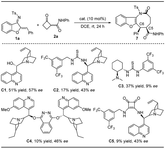 The catalytic asymmetric version of the Michael addition/ring-expansion cascade has also been explored using a chiral base such as a cinchona alkaloid, quinine-derived bifunctional thiourea catalyst, Takemoto catalyst and dimeric quinidine derivatives, as well as quinine-derived squaramide catalyst. As indicated in Scheme 5, the product 3aa was obtained as cis diastereomers at the C5- and C6- positions when chiral bases were used as catalysts. Although the yields and the enantioselectivities are not synthetically practical at the current stage (cat. C1, up to 51% yield, 56% ee), these results demonstrate that this protocol might provide opportunities for stereoselective library collections.