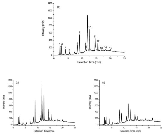 Chromatograms of coffee samples recorded using UV detection at 254 nm. (a) Ristretto, (b) Profondo, and (c) Onyx 12.