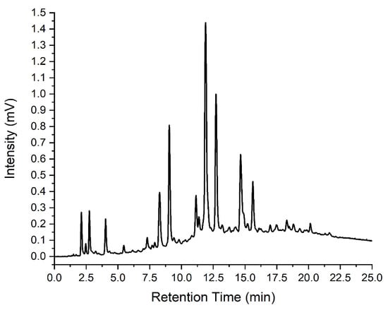 The chromatograms illustrated in Figure 3a–c are the UV detection profiles for the (a) Ristretto sample, (b) the Profondo sample, and (c) the Onyx sample, each from the L’Or brand. The UV chromatographic responses for the Ristretto and Profondo coffees are very similar, which ultimately makes it difficult to readily visualize with certainty the differences between these coffees. The chromatogram for the Onyx 12 coffee is, however, more readily distinguishable from those of the Ristretto and the Profondo.