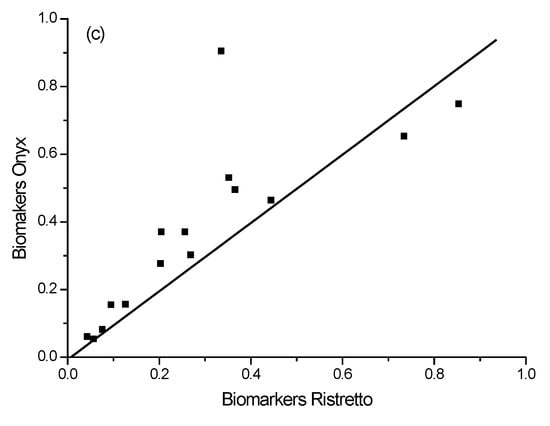 Comparative plots of normalized peak heights for the 15 indicators: (a) Organic Ristretto versus Ristretto—both L’Or brand, (b) Profondo versus Ristretto—both L’Or brand, and (c) Onyx 12 versus Ristretto—both L’Or brand.