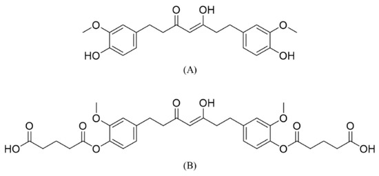 - Muangnoi, C.; Jithavech, P.; Ratnatilaka Na Bhuket, P.; Supasena, W.; Wichitnithad, W.; Towiwat, P.; Niwattisaiwong, N.; Haworth, I.S.; Rojsitthisak, P. A curcumin-diglutaric acid conjugated prodrug with improved water solubility and antinociceptive properties compared to curcumin. Biosci. Biotechnol. Biochem. 2018, 82, 1301–1308. [Google Scholar] [CrossRef] [PubMed]