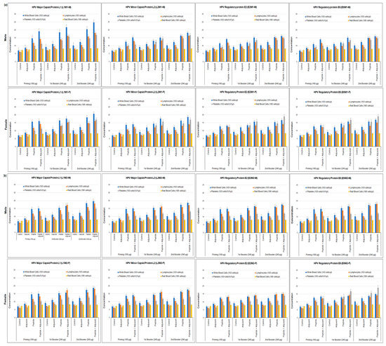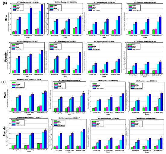 Hematological assays indicate the primary response to the peptides. The blood components of rats were analyzed after immunization to evaluate the efficiency of epitopes, tested with or without adjuvant. The control rats were used to compare with sampled animals and both were kept as same conditions. A substantial increase in the count of different blood Cells was observed when treated with predicted antigenic peptides. At second booster dose of 240 µg, an increased numbers of white blood cells (WBCs), lymphocytes (LYM), platelets (PLT) and RBCs were observed in the samples compared to priming and first booster doses and control. In our analysis, we studied the gender-wise immune response and observed that the epitope of L1M1 (viral major capsid protein) in complex with CFA showed a substantial level of WBCs in male rat (24.68 × 103 cells/μL) compared to female rat samples at the second booster dose. However, the antigenic peptides L2M1 (18.16–18.68) and E2M1 (16.17–16.67) revealed almost the same level of immune response in female and male rats at this concentration. We observed an insignificant level with independent injection of CFA (Figure 3a). Similarly, at the second booster doses (240 µg) of MHC class II peptides, a significant number of WBCs, LYM, and platelets were observed in both male and female rats. L1M2 induced a comparatively increased level of production of WBCs and LYM compared to L2M2, E2M2, and E6M2 (Figure 3b).