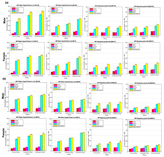 IgG analysis of (a) MHC Class-I (b) MHC Class-II, antigenic peptides measured by ELISA assays. Blood samples of experimental male and female rats immunized with potential epitopes (individual peptides) emulsified with and without adjuvant at primary, first and second booster doses. The titer rate of IgG antibodies is given in g/L. All data were compared to control group. Bars represent ‘mean; which is signified (*) with p-value (<0.01) and standard deviation (SD).