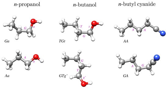 The geometries of the relevant conformers of the three studied molecules are displayed in Figure 1. In order to avoid confusion with the immediately preceding papers on these molecules, we retained the conformer notation used therein. We note, however, that the earlier used T designation used for trans has more recently been superseded by A for anti when referring to non-planar molecules. Thus, the two species of n-propanol have previously been denoted as GT and TT, while the two n-butanol species would in this scheme be denoted by AGa and Gag’.