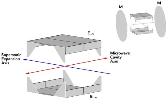 The electrodes (E) developed in Warsaw for ensuring improved electric field uniformity for Stark measurements on supersonically expanded samples and (upper right) their placement between the 50 cm diameter mirrors (M) of the Fabry-Perot resonator used for microwave measurements. The electrodes are in the form of 28 × 28 cm parallel plates, placed 27 cm apart, with additional side plates designed by numerical computations to focus the electric field in the interaction volume between the supersonic expansion plume and the microwave resonator mode. The main and side plates can be split into two parts for insertion and assembly through the easily accessible (15 cm and 10 cm diameter) central ports of the spectrometer chamber.