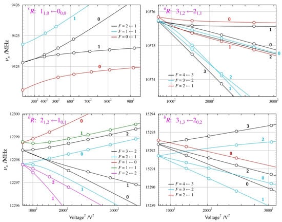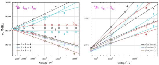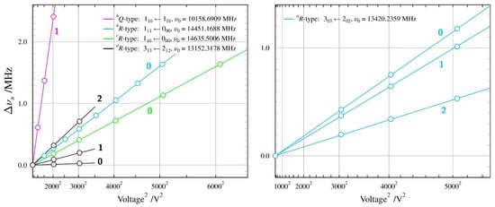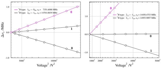 Stark electrode calibration: This is a compulsory step in Stark effect measurements, whereby the effective electrode separation is first determined by measuring the Stark shifts for a molecule with an accurately known dipole moment. In this way, any effects that may be outside the direct design control are accounted for. The relatively low electric fields attainable between the electrodes in supersonic expansion experiments have the result that the most common calibration with the J = 1←0 transition of the OCS molecule at 12,162.97 MHz is less than optimal. The dipole moment of OCS is relatively low at 0.715196(10) D [], resulting, typically, as in our spectrometer, in a relatively small Stark frequency shift of less than 0.8 MHz for an already sizable voltage difference of 10 kV between the electrodes. For this reason, the possibility of using molecules with significantly larger dipole moments was investigated. Methyl iodide (CH3I, µ = 1.6406(4) D, []) and methyl cyanide (CH3CN, µ = 3.92197(13) D, []) turned out to be very useful in this respect. Their J = 1←0 transitions are near 15 GHz (CH3I) and 18.4 GHz (CH3CN), and each such transition is, furthermore, split into several hyperfine components, resulting from the presence of an atom with a quadrupolar nucleus. There is, therefore, plentiful data that can be acquired concerning the cell calibration, and the only reason hindering its previous use was the lack of a suitable computer program. Once this became available (see below), much more precise electrode separation calibrations could be performed. The results of the presently carried out calibrations for the Ne carrier gas-based expansions for both molecules are included in Supplementary Materials File S1. In these calibrations, the measured Stark shifts for CH3I were up to 4.4 MHz for applied voltages up to 12.3 kV, and for CH3CN Stark shifts were up to 12 MHz for voltages up 8.5 kV. The effective cell separations determined from these two calibrations were 26.972(3) cm from CH3I and 26.974(2) cm from CH3CN, in excellent agreement with each other, even in view of the very small statistical errors. In practice, it is considered safer to increase the estimated calibration uncertainty in order to account for various possible experimental effects, such as the possible changes in the shape of the supersonic expansion plume during measurements. For this reason, the calibration uncertainty is increased to 0.02 cm [,] and used in error propagation in all our dipole moment determinations.