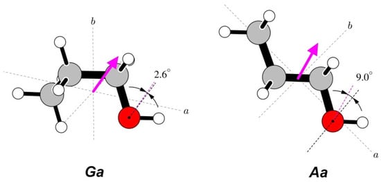 The total dipole moment does not carry direct information concerning its origin in a given molecule and is conventionally drawn from the centre of mass of the molecule, as in Figure 4. The direction of this vector quantity is not experimentally available but can be assigned on the basis of quantum chemistry computations. The actual origin of the dipole moment is expected to be in the small imbalance of electron charge distribution in the chemically active group terminating the aliphatic chain, in this case, of the hydroxyl group. While such information is, again, not directly available from the dipole moment measurement, it is possible to compare its angular orientation with that of its suspected carrier. Figure 4 shows that both the direction and dipole moment orientation for the Ga conformer are very close to that of the ∠COH bisector, while, for the Aa conformer, there is a significant deviation of the dipole moment direction towards the aliphatic chain.