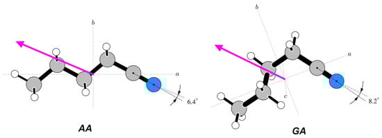 For n-butyl cyanide, it is the nitrile group that is expected to be the carrier of the dipole moment. Comparison of the orientations relevant to this point is made in Figure 10. It can be seen that, for both conformers, the positive dipole moment axis is shifted significantly towards the alkyl group. There is a greater angular shift for the GA conformer, in which the alkyl chain is more folded and thus closer to the nitrile group.
