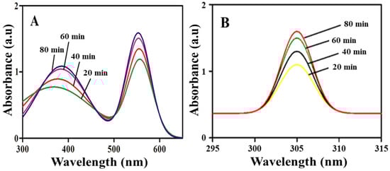 UV-visible absorbance spectra recorded for Ni/ZnO nanocomposite (A) and ZnO (B) at different time intervals.