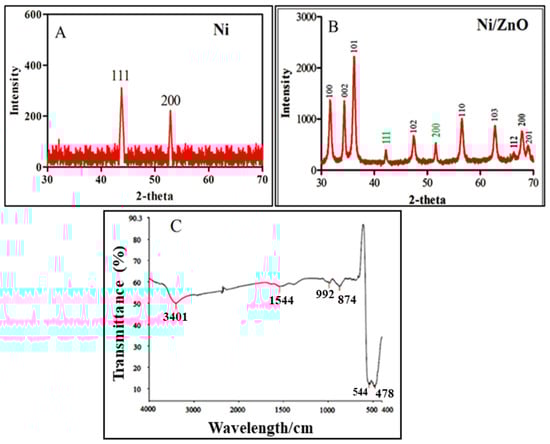 (A) Powder XRD pattern of the crystalline Ni nanoparticles and (B) Ni/ZnO nanocomposite. (C) FT-IR spectra of Ni/ZnO nanocomposite.