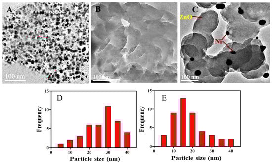(A) Typical HRTEM graphs of (A) Ni, (B) ZnO, (C) Ni/ZnO nanocomposite, and (D,E) particle size distribution of Ni both individual and in composite with ZnO, respectively.