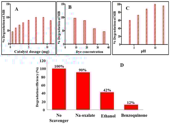 The addition of NaOH and HCl adjusted the solution’s pH. To check the influence of the pH, the solutions have a pH range of 4–11. The solution was irradiated for 60 min with (9 mg/L) dye concentration. The result indicates that 60%, 70%, 80%, 100%, and 96% MB were degraded at pH values of 4, 6, 8, 10, and 11, respectively (Figure 6C). This means that with an increase in pH up to an optimum value (10), the catalyst shows high photocatalytic efficiency and the maximum amount (100%) of MB was degraded. While in case of pH higher than 10, a reduction in the photodegradation efficiency of catalysts was recorded.