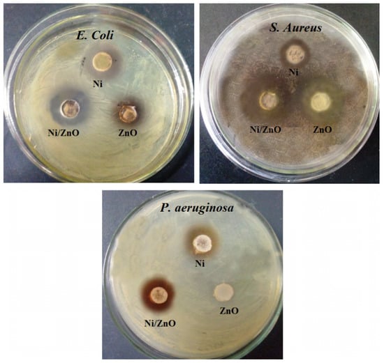 Using the agar well diffusion method, the antibacterial activity of the Ni/ZnO nanocomposite was evaluated against three bacterial strains, namely E. coli, S. aureus, and P. aeruginosa [46]. The bacterial strains were cultivated in broth media and kept at 37 °C until they were transferred to Petri dishes using a sterile glass rod. Using a sterile cork borer, 6 mm-wide holes were drilled into nutrition agar (Merck, Darmstadt, Germany) plates. Laterally, a suspension of 1 mg/mL of Ni/ZnO nanocomposite were prepared in double distilled water. Then, 50 µL suspension of Ni/ZnO nanocomposite were carefully poured into the holes by using a micropipette and kept the plates for 80 min under visible light irradiation. Finally, the plates were incubated for 18 to 20 h at 37 °C to determine the zone of inhibition.