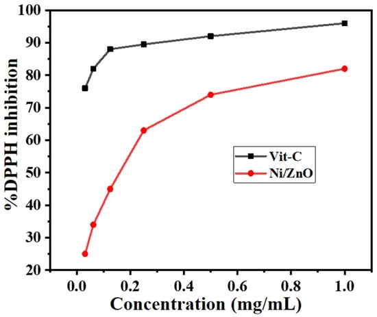The antioxidant test of the Ni/ZnO nanocomposite was assessed by utilizing vitamin C as a reference and DPPH conversion from radical to a stable form. According to the findings in Figure 9, nearly all radicals were stabilized, and the radical conversion efficiency of the Ni/ZnO nanocomposite increased with concentration. When the Ni/ZnO nanocomposite concentration was 1 mg/mL, however, the inhibition of DPPH may increase to a maximum of 82%. Apart from the Ni/ZnO nanocomposites high chemical activity, the high capacity of the Ni/ZnO nanocomposite to deactivate these free radicles could be attributed to the dispersibility of nanoparticles through the media due to their tiny particle size. The oxygen-releasing antioxidant may boost cells ability to multiply, migrate, grow, disseminate, and accelerate the healing process [45]. Therefore, Ni/ZnO nanocomposite exhibits a moderate antioxidant activity.