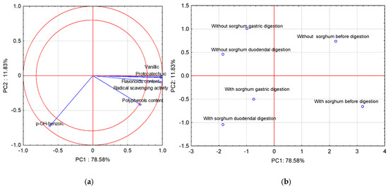 Projection of variables: total content of polyphenolic compounds and flavonoids content of free phenolic acids in pasta on the PC1 and PC2 scores plot—(a); projection of cases characterizing the pasta before and after two-stage digestion and with the sorghum addition on the PC1 and PC2 loadings plot—(b).
