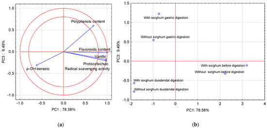 Projection of variables: total content of polyphenolic compounds and flavonoids content of free phenolic acids in pasta on the PC1 and PC3 scores plot—(a); projection of cases characterizing the pasta before and after two-stage digestion and with the sorghum addition on the PC1 and PC3 loadings plot—(b).