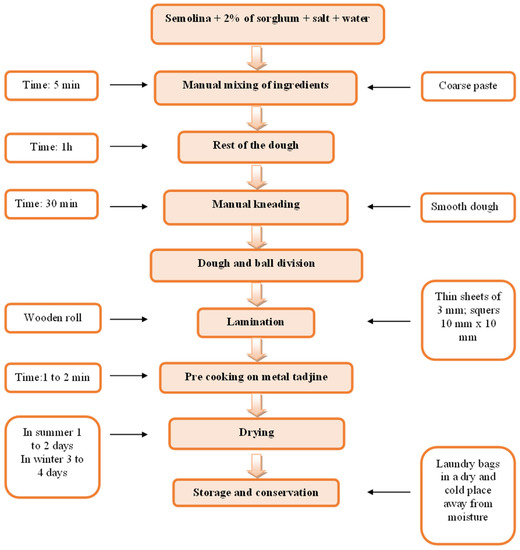 Semolina and red colored sorghum (Sorghum bicolor (L.) Moench) were purchased from the local Algerian market. Sorghum flour was produced from sorghum grain samples that were milled (Chopin Moulin CD1; Chopin S.A., Villeneuve la Garenne, France) and then sieved using a planetary sieve (Buhler AG, Uzwil, Switzerland, screen size 120 µm2).