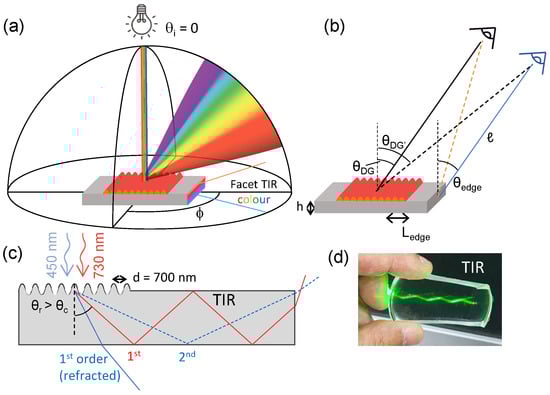The resulting structural colour at the facet can be modelled using the principles of TIR within a medium. The angular dispersion of the incident white light from a flood-illuminating source is also included in the model, to reflect practically-relevant conditions. We first describe the behaviour of a sample with a surface diffraction grating of periodicity d = 700 nm, depicted in Figure 3. Figure 4a is a schematic diagram showing three selected wavelengths, = 450, 480 and 730 nm, of light incident on the diffracting surface of the sample. These wavelengths were chosen due to their peak positions in the transmission measurements. We first consider that the rays are incident on the grating where = 0. Within the medium, the general diffraction equation can be modified for a transmission diffraction grating to take into account the respective refractive index ( in air, in PDMS):