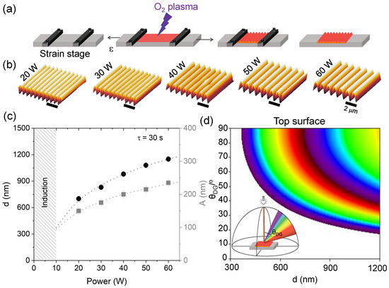 We have fabricated a range of one-dimensional (1D) wrinkled structures by applying uni-axial mechanical strain ( = 0.5) on PDMS coupons, subsequently exposed to oxygen plasma at varying power (20–60 W). Upon relaxation of strain, the bilayer yields a sinusoidal profile, at sufficiently low deformations (Figure 2a). Wrinkles of different periodicities are readily obtained from the variation in plasma power (at constant exposure time), as shown by the atomic force microscopy (AFM) profiles in Figure 2b. The associated periodicity d and amplitude A can be expressed as [45,46],