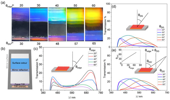 Similarly to surface structural colour derived from the diffraction of light in reflection from a wrinkled surface, the observation of facet TIR colour is also expected to be angle-dependent. Light diffracted in transmission can be further propagated via TIR, under specific conditions, resulting in structural colour (indirectly) appearing on the facets of transparent materials. Figure 3a shows a series of optical images, taken at varying observation angles, of a sample with surface grating periodicity d = 700 nm (fabricated with plasma conditions P = 20 W, = 30 s, = 0.5), that exhibits a range of structural colours. For clarity, the sample was placed on a mirror that acts as a reflective substrate and was observed at at 10 intervals of observation angle, from 20 to 60. Concurrently, the surface structural colour can also be viewed, but with an offset angle of ranging from 30 to 65 when l = 10 cm and = 2 cm. The white line on the optical images indicates the boundaries between facet colour and the mirror reflection. Figure 3b shows a schematic of the sample set-up, including the role of the “TIR (mirror)” where refracted rays from the facet impinging onto the mirror result in an additional colour perceived (which can be different from the facet colour).