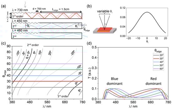 (a) Schematic diagram representing the modelling calculations, for a given coupon dimensions (height h, length ) and periodicity d, each individual wavelength is ray-traced, diffraction orders that do not meet TIR conditions are excluded, and the refracted colours at the edge computed as a function of . (b) Schematic depicting the distribution of incident angles onto a point in the sample and illustrative of angular dispersion, described by a Gaussian profile with a half-width at half-maximum (HWHM) of 10. (c) Computed relation between () and at fixed for the 1st and 2nd diffraction orders. Representative fixed angles are shown by the horizontal lines. (d) Predicted spectra for the edge colour, assuming the Gaussian distribution shown in (b), and accounting for the light source distribution (Figure S1). At this d, the edge colour is expected to change from red-dominant to blue-dominant upon increasing , in agreement with Figure 3a,c.