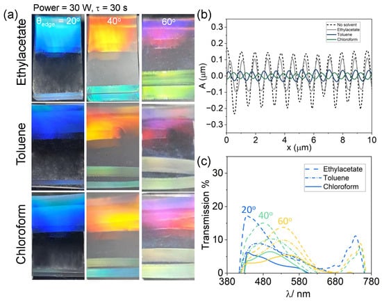 Structural colour can reflect environmental conditions that affect the surface grating nanostructure. Environmental factors can include the presence of solvents in a liquid or gas atmosphere, or a medium with different refractive indices. When PDMS is exposed to a range of solvents, it can swell and deform significantly. Wrinkled samples (P = 30 W, = 30 s) were soaked in different solvents, ethyl acetate, toluene, and chloroform for 10 min each. These solvents were chosen for their different swelling ratios: 1.18, 1.31, and 1.39, respectively [48]. Prior to optical and AFM imaging, solvent-soaked PDMS coupons were carefully pad-dried with absorbent tissue paper to remove excess solvent, and allowed to air-dry for 2 min. Care was taken not to over-dry the sample and reverse swelling (as demonstrated with toluene and chloroform, for instance) [48,49,50]. The solvent-soaked samples can be seen in the optical images in Figure 6a, viewed at increasing at 20, 40 and 60. When the samples are exposed to solvents with increasing swelling ratios, the facet colours appear to be disproportionately affected, decreasing in intensity. From the AFM scans of the solvent-exposed samples in Figure 6b, we observe that the wrinkling amplitude decreases from its original to a greater extent with solvents of higher swelling ratios (from A ≈ 175 nm with no solvent to 12 nm with chloroform) while experiencing a marginal increase in periodicity (d = 830 nm to ≈900 nm). The marginal increase in periodicity results in a negligible change in structural colour on the surface, however, the decrease in amplitude causes a decrease in measured transmission intensity, shown in Figure 6c. Due to the reversibility of the swelling process [51], such systems have potential uses in sensor technology.