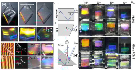Incorporating surface grating with a prism, we demonstrated the fabrication of GRISMs (Figure S5). In this context, a GRISM is a compound optical element that significantly reduces the influence of light dispersion from the individual elements. A prism deflects violet light more than red, while a diffraction grating deflects red more than violet. By combining the two, light can be separated into its components while offsetting the beam deviations resulting from each element. In a simple realisation of a GRISM, we placed model prisms made of either PDMS (n = 1.41) or glass (n = 1.52) on top of a wrinkled PDMS sample (P = 40 W, d = 980 nm) to create GRISMs (PDMS, and Glass:PDMS) as shown in the schematic in Figure 7b. The samples were placed such that the wrinkled surface was in contact with the prism. Employing white light, the GRISMs were viewed at increasing , from 15 to 40. is taken from the normal of the base of the GRISM, directly under the centre of the incident light.