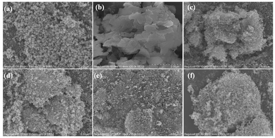 The morphology and microstructure of Fe3O4, MoS2, Fe-Mo-1, and Fe-Mo-2 observed by SEM are shown in Figure 1a–f. Figure 1a shows the microscopic images of Fe3O4 magnified 20k times. It can be seen that the nano-Fe3O4 sample prepared in this work is spherical, the diameter of the spheres is not uniform, the average is about 200 nm, the surface of the nanospheres is rough, and the compact between the nanospheres makes the comparison area of the samples smaller. Figure 1b shows the microscopic image of MoS2 magnified 20k times. It can be seen that MoS2 is flaky with a smooth surface and each piece is irregular in shape and size. Figure 1c,d shows the microscopic images of the Fe-Mo-1 sample magnified 10k and 20k times, respectively. It can be found that Fe3O4 nanospheres were grown on MoS2 nanosheets and the density of the nanospheres decreased so that more surfaces of the nanospheres were exposed, making the comparative area of the Fe-Mo-1 sample increase and sunlight be more easily absorbed, so this sample has a higher potential for solar absorbance [24]. Figure 1e,f shows the microscopic images of sample Fe-Mo-2 magnified 10k and 20k times, respectively. The figure shows that the nanoparticles on the surface of the sample are denser compared to those of Figure 1c,d, which is mainly due to the higher Fe3O4 content in the reactants.